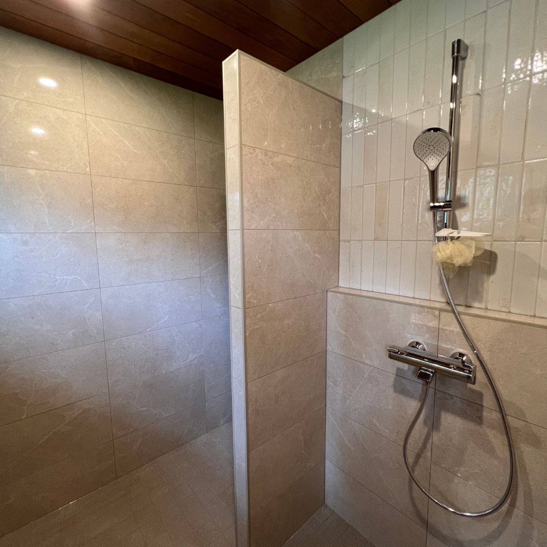 - Kalustejärjestystä muutettiin toimivammaksi, ja suihkuseinämä rakennettiin kiinteäksi laatoitetusta märkätilalevystä. Suihkun paikka siirrettiin käytännöllisemmäksi.
