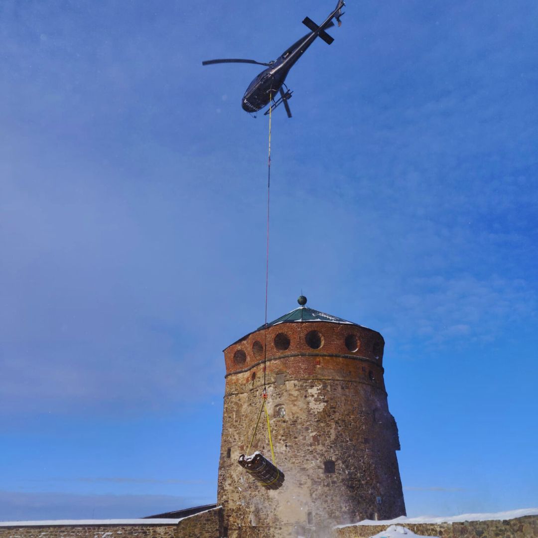 Lähtökohtaisesti raskaammat materiaalit tuodaan linnaan vesiteitse Kyrönsalmen kautta, mutta tässä urakassa helikopteri oli selkeästi optimaalinen ratkaisu.